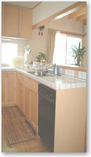 若いご夫婦のこだわりのキッチンはオーダーメイド1枚1枚貼り付けたタイルのトップが、ナチュラルな雰囲気でとてもおしゃれに仕上がりました。 |