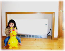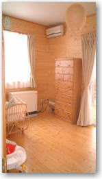 | 木目が美しいパイン材の風合いがたっぷりのお部屋に、蓄熱式の暖房器で、赤ちゃんの健康にも安心 子育てにも余裕が出来そうですね。 |