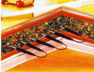 床下に蓄熱材(自然の石でヒーターをサンドイッチにする石焼きいも工法)を設置し深夜電力を利用して60~70℃まで加熱させ、蓄熱材(自然石)に蓄えた熱で床表面の温度を30℃以上に持続させる方法で、火気が無く、子供や老人にも安心で、暖かく快適な住空間を経済的に実現した床暖房システムです。ご希望により蓄熱効果の高いセリサイト鉱石を使用できます。 |